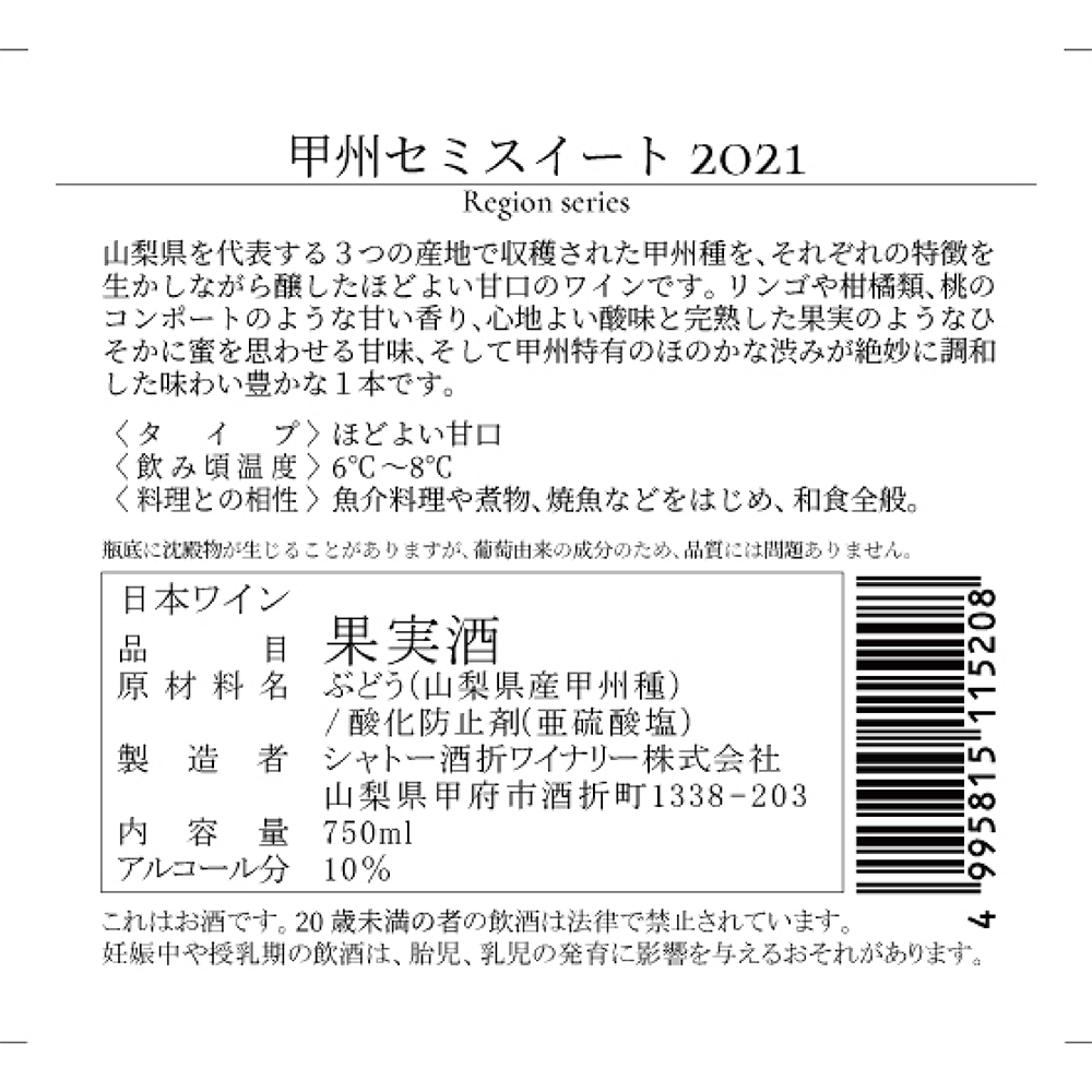 桃のコンポートのような甘味ですが、後味はすっきり。やや甘口なんだけどちゃんと酸味もあり。飲み疲れや飲み飽きはしない。醤油・みりんを使った料理と相性が良いので、日本人の好みに合うワインだと思います。「セミスイート」だからと毛嫌いしないで一度お試しいただきたいワインです。