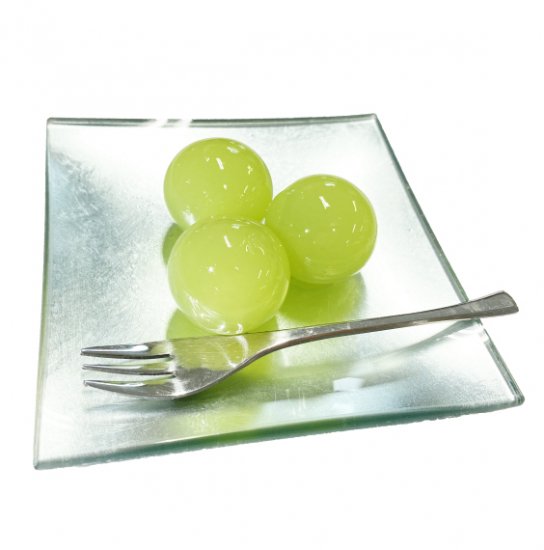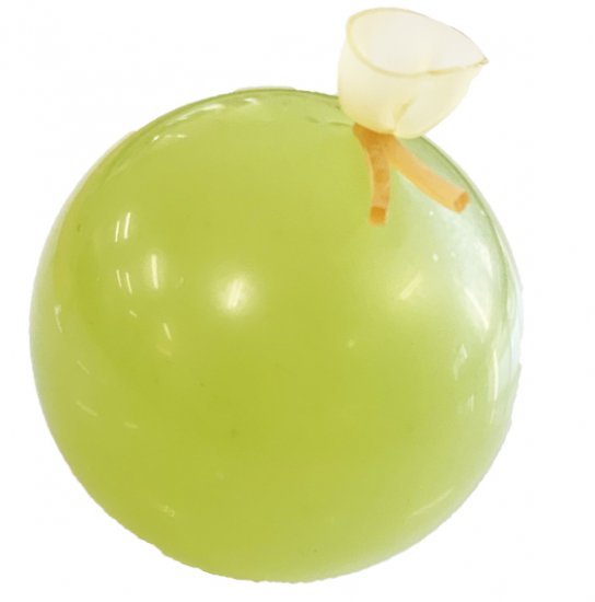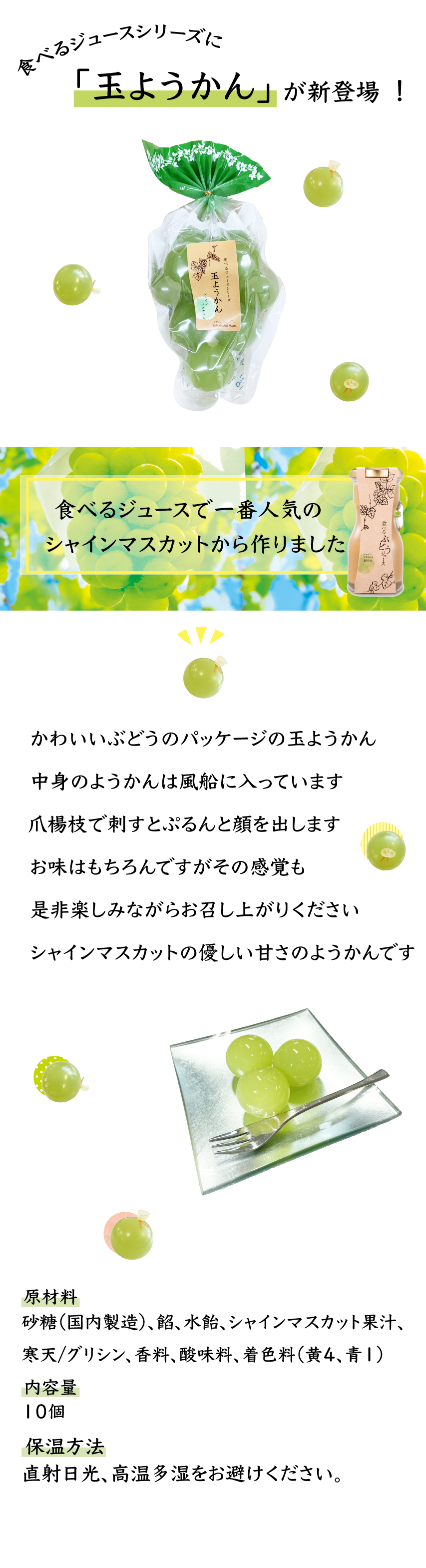 食べるジュースで一番人気のシャインマスカットから作りました。かわいいぶどうのパッケージの玉ようかん。中身のようかんは風船に入っています。爪楊枝で刺すとぷるんと顔を出します。お味はもちろんですが、その感覚も是非楽しみながらお召し上がりください。シャインマスカットの優しい甘さのようかんです。
